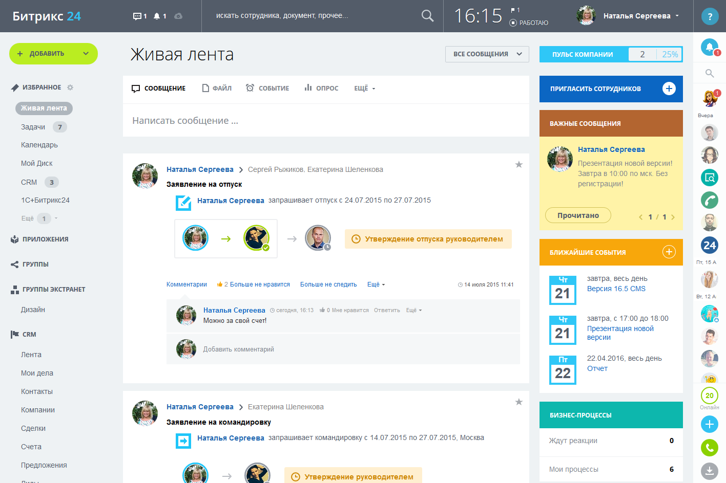 Воспользуйтесь готовыми шаблонами бизнес-процессов или создайте свои. Настройте с помощью визуального проектирования произвольных бизнес-процессов управление самыми разными бизнес-процессами. Организуйте коллективную работу, задействовав бизнес-процессы и включить элементы контроля над их выполнением. Работа в компании станет более слаженной, управляемой и эффективной!